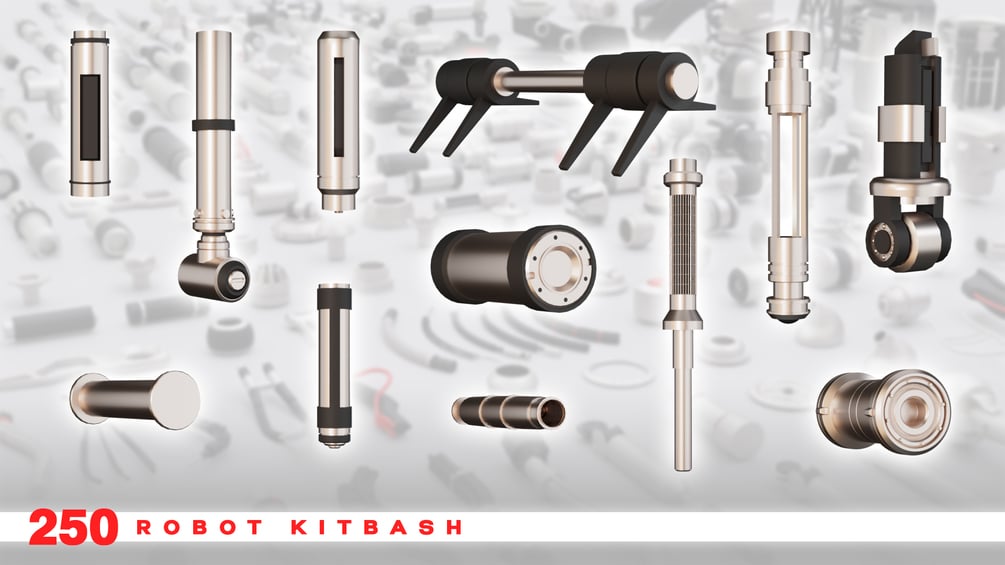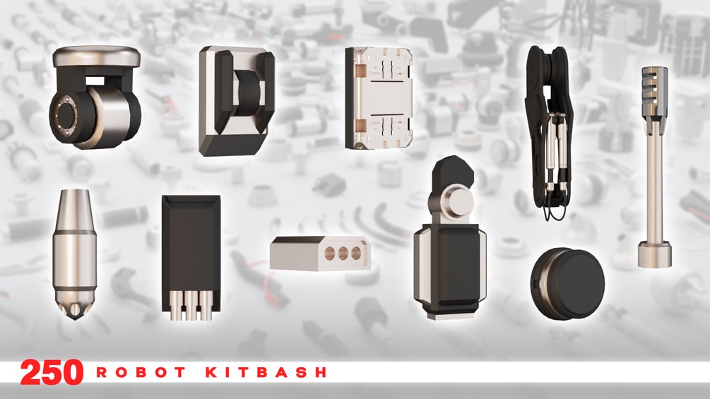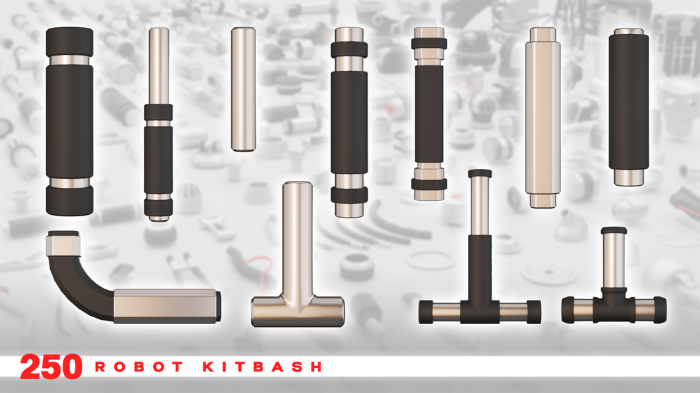 Robot kitbash includes 250 hardsurface objects designed to build robots and mechanical machines and covers a wide range of designers' needs, such as: