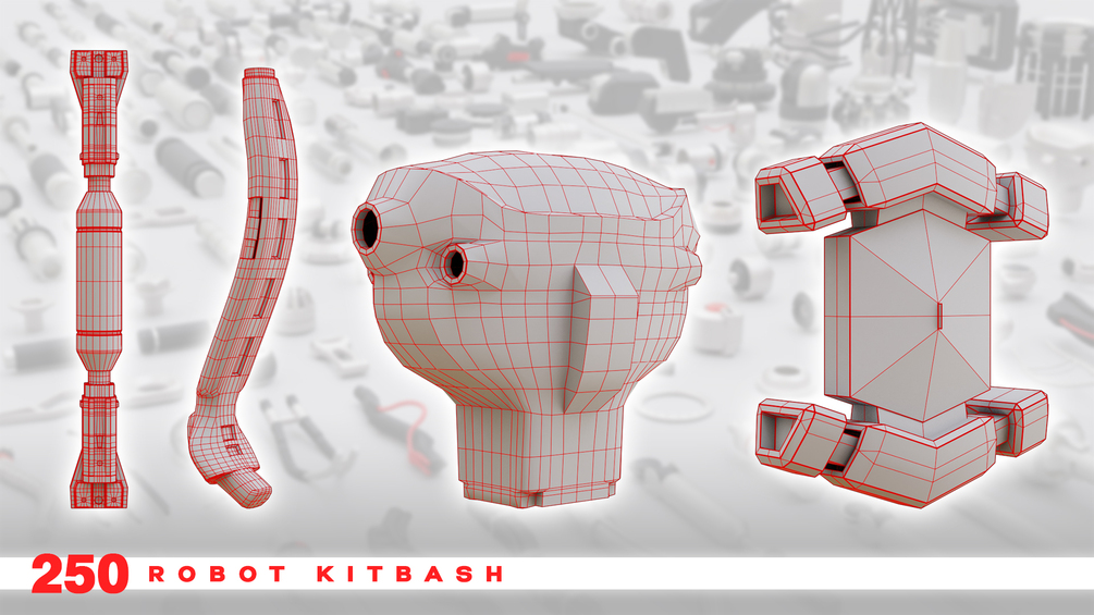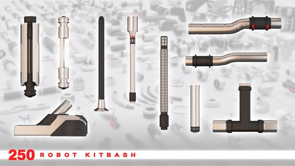 Robot kitbash includes 250 hardsurface objects designed to build robots and mechanical machines and covers a wide range of designers' needs, such as: